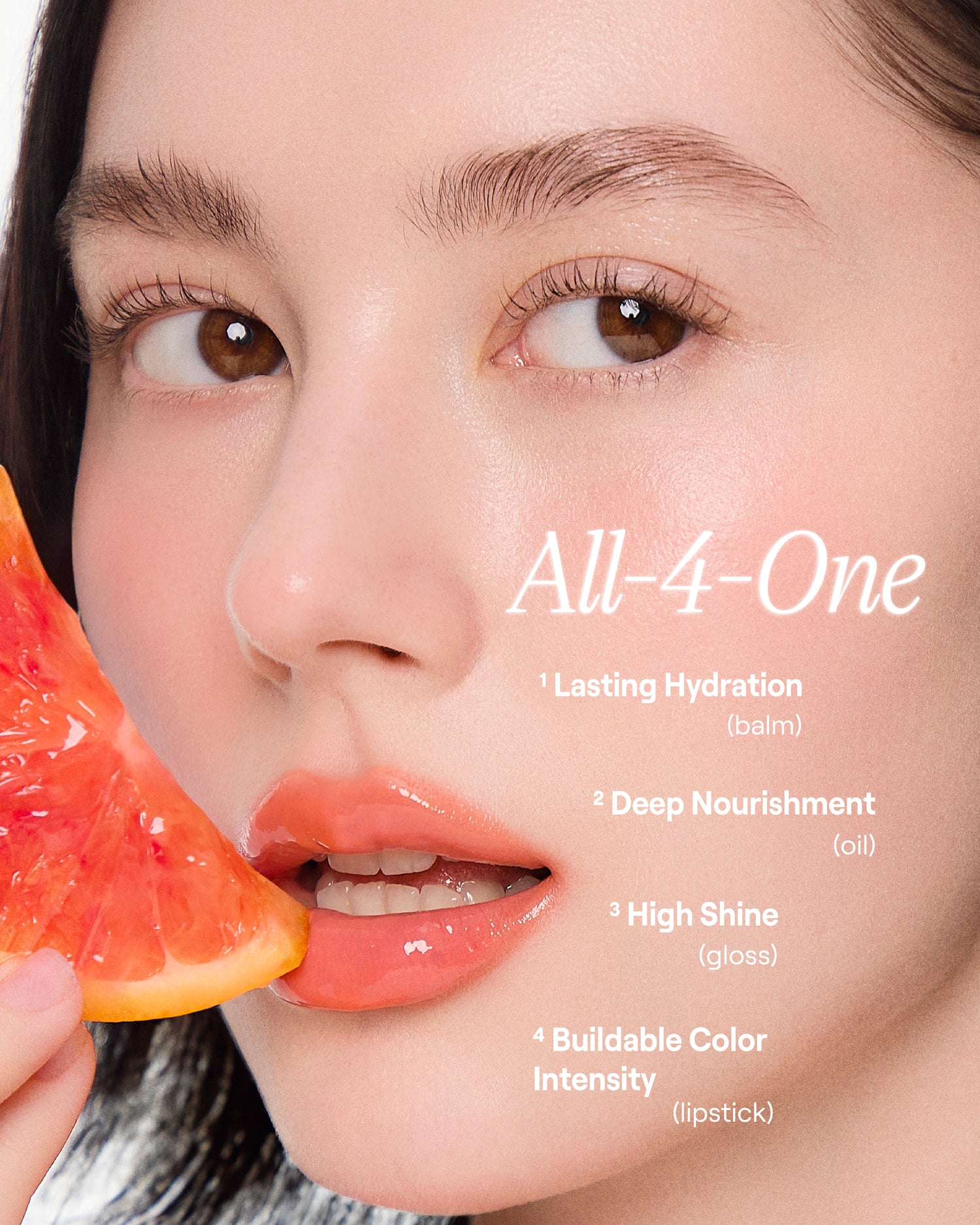 All-4-One: Lasting Hydration (balm) + Deep Nourishment (oil) + High Shine (gloss) + Buildable Color Intensity (lipstick).